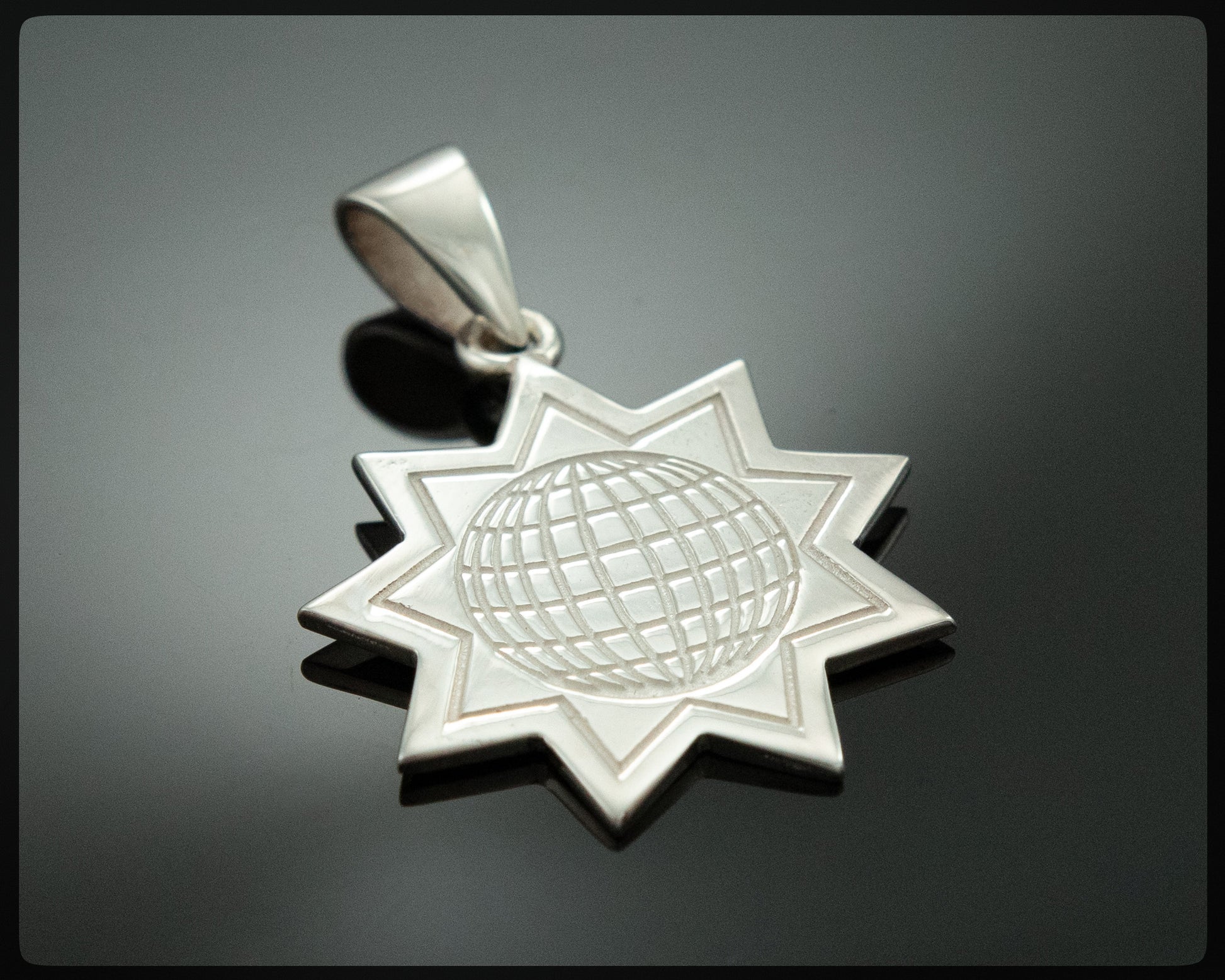 Beschreibung: Dieser Anhänger aus massivem 925er Sterlingsilber hat die Form eines neunzackigen Sterns mit einer fein ziselierten Weltkugel im Zentrum. Der Stern symbolisiert Einheit und Harmonie, die Weltkugel die Einheit der Menschheit und ist somit ein bedeutungsvolles Emblem einer Weltreligion.