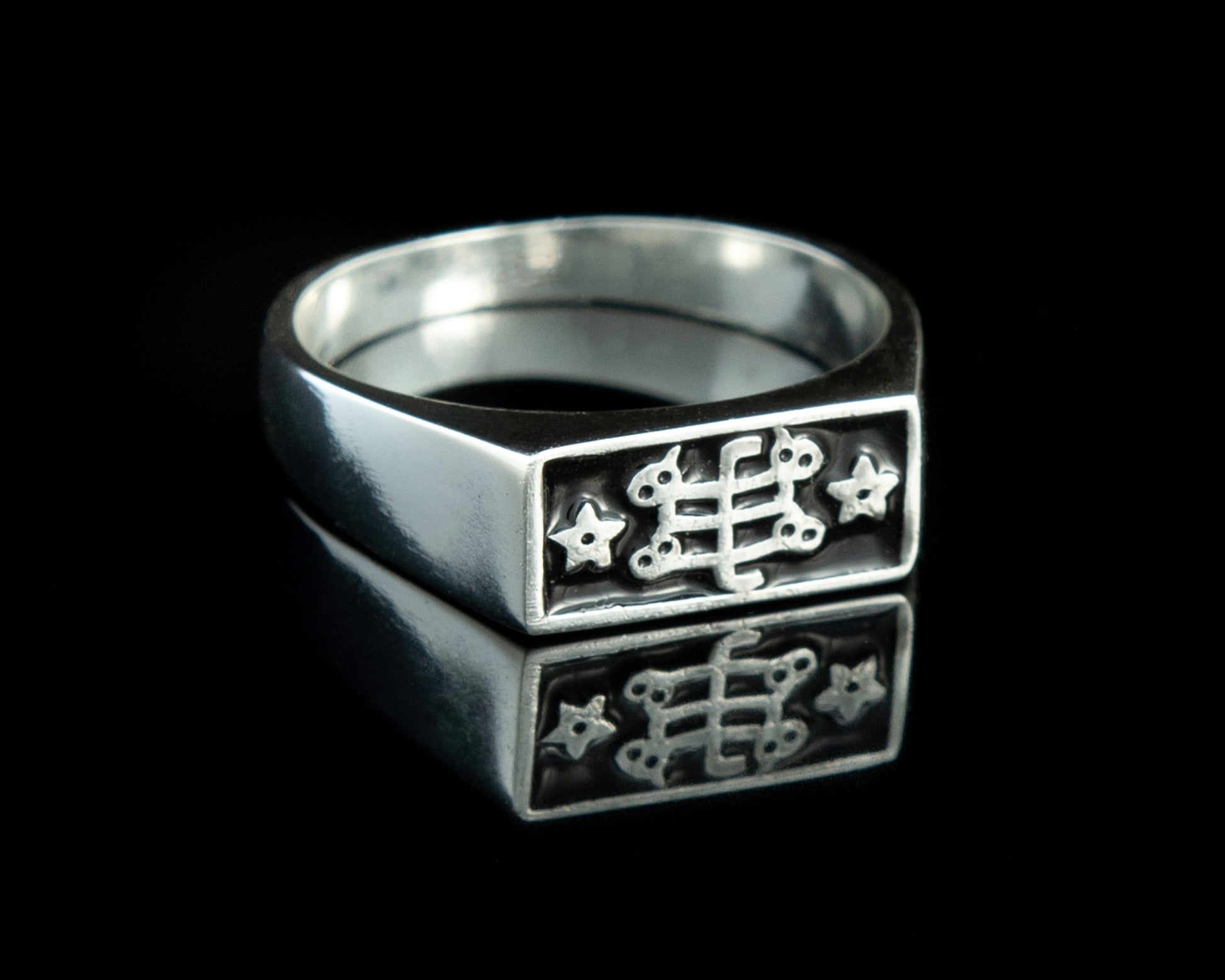 Dieser exklusive Ring aus Sterlingsilber mit dem Baha'i-Ringstein-Symbol setzt garantiert ein Statement. Mit seiner detailreichen und kunstvollen Prägung verleiht dieses elegante, handgefertigte Schmuckstück Ihrem Look einen Hauch von Raffinesse und Eleganz. Erhältlich in den Größen 4 bis 13.