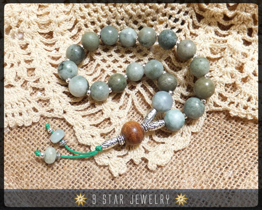Moss Agate & Aquamarine on green nylon knot - Baha'i Prayer Beads -"Terrene"