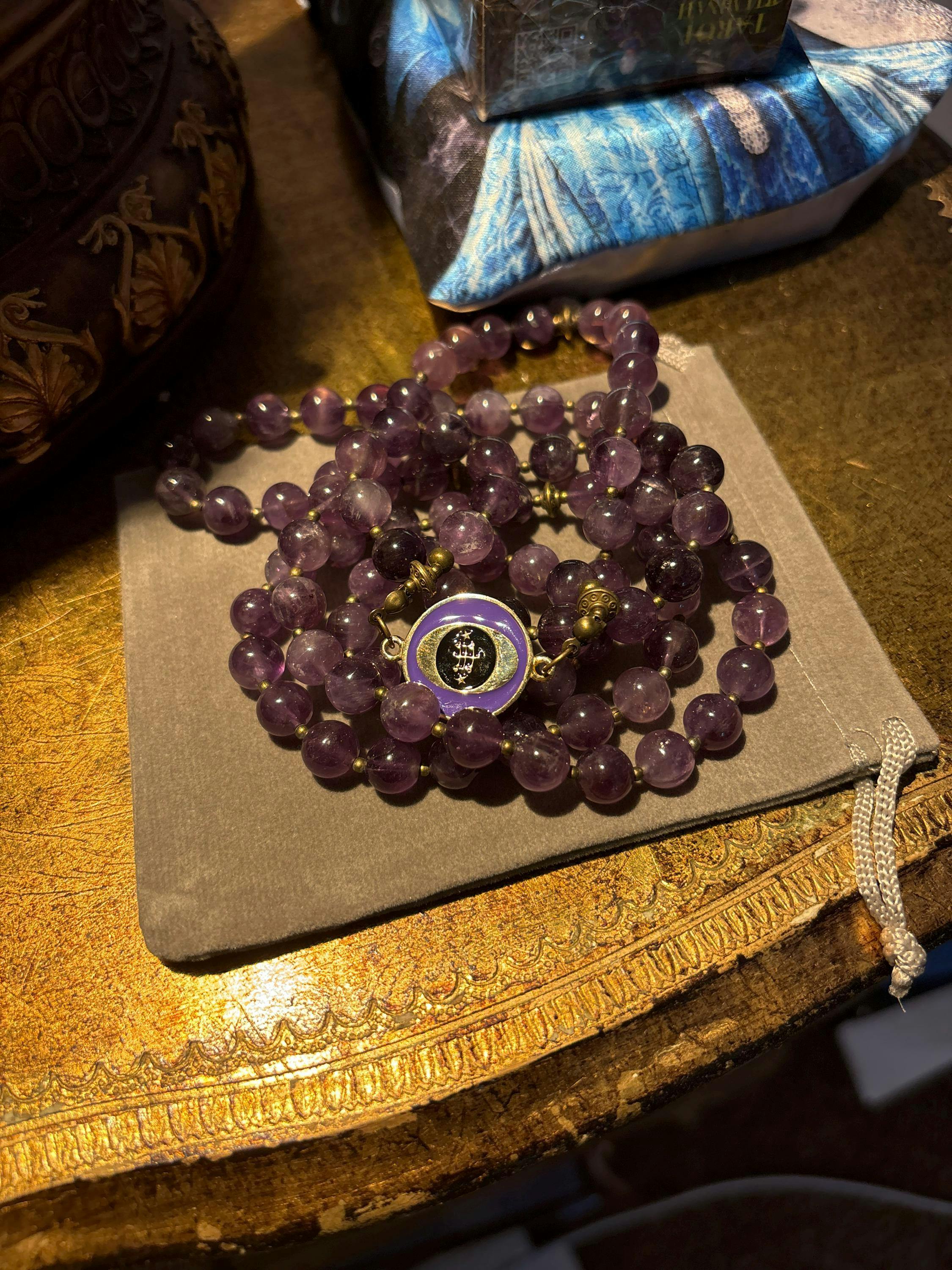 Made with amethyst, brass baha'i ringstone symbol, bronze tone seed beads and durable beading cord.